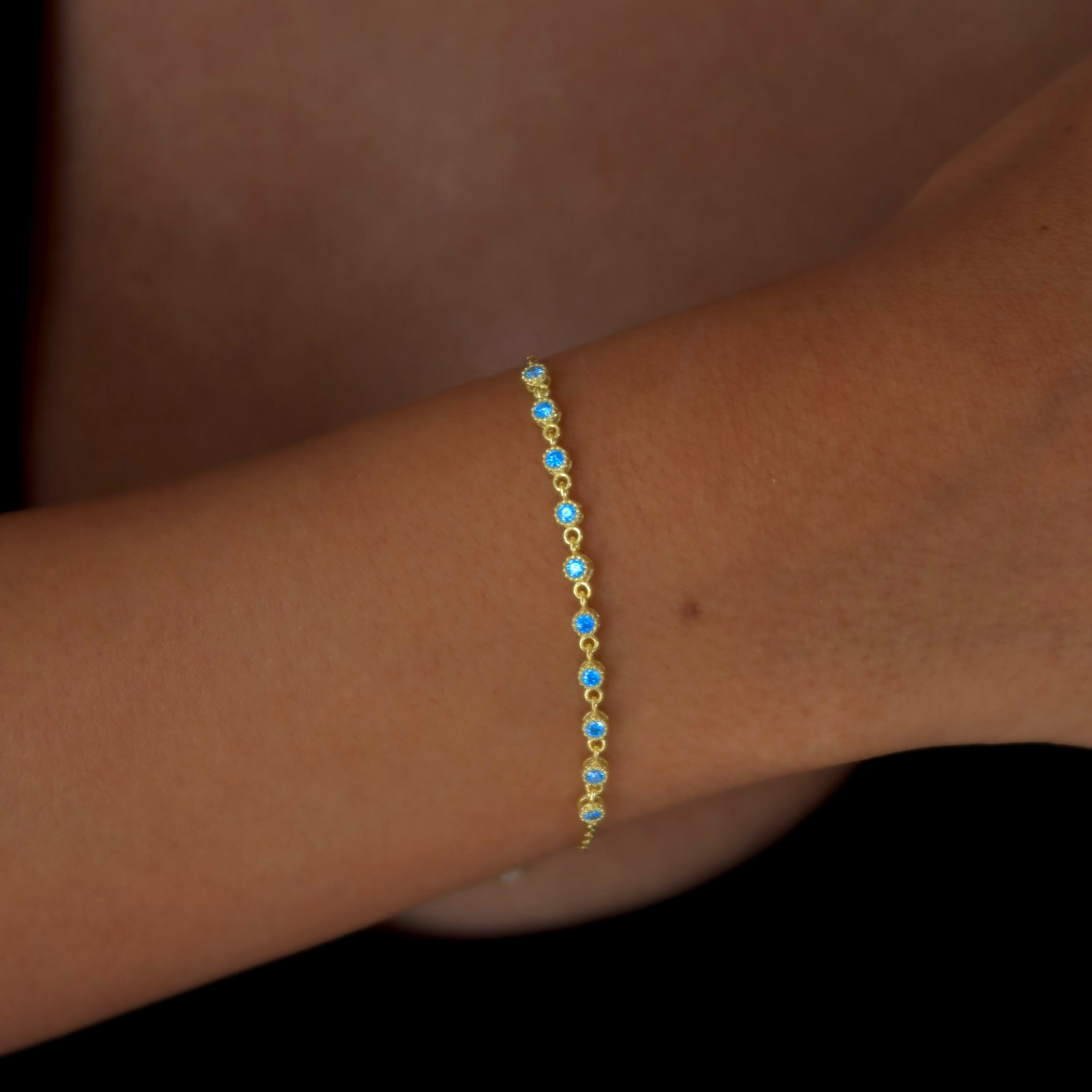 Blue Drops Bileklik, 925 ayar gümüştür. Gold seçeneğinde altın kaplama yapılmaktadır. Uzunluk 15 cm'dir +5 cm uzatma zinciri vardır. Kapalıçarşı’daki atölyemizde ustalıkla üretilmiştir.