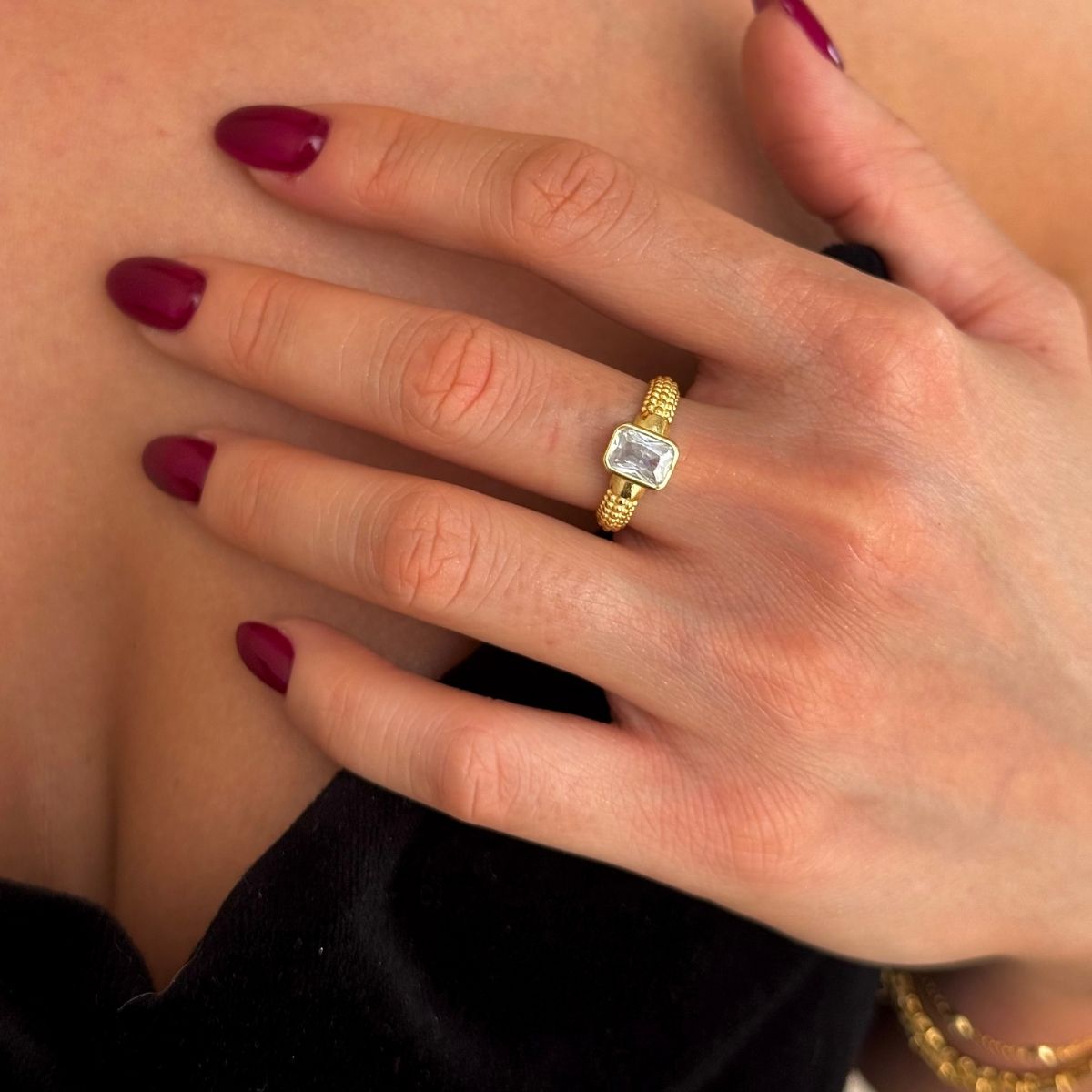 Baget Taşlı Yüzük, 925 ayar gümüştür. Gold seçeneğinde altın kaplama yapılmaktadır. Ayarlanabilir formu sayesinde farklı parmak ölçülerine kolayca uyum sağlar. Kapalıçarşı’daki atölyemizde ustalıkla üretilmiştir.