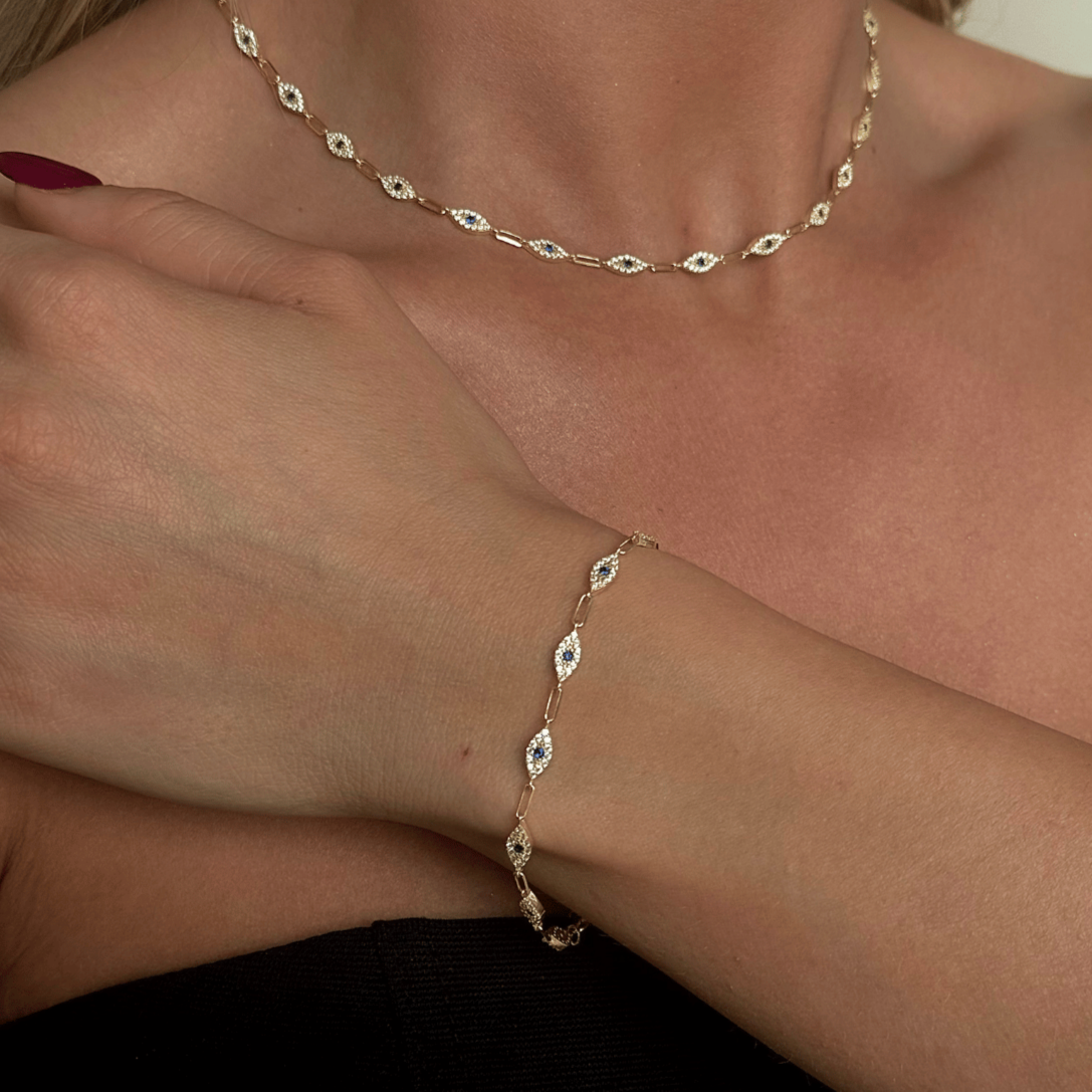 Taşlı Göz Figürlü Set, 925 ayar gümüştür. Bileklik uzunluğu 15 cm, kolye uzunluğu 35 cm'dir +5 cm uzatma zincirleri vardır..