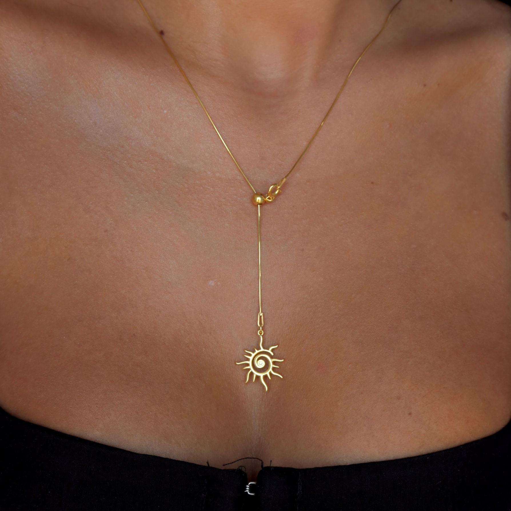 Asansör Zincirli Spiral Güneş Kolye, 925 ayar gümüştür. Altın seçeneğinde altın kaplama yapılmaktadır. Zincir uzunluğu 40 cm + 5 cm uzatma zincirlidir.