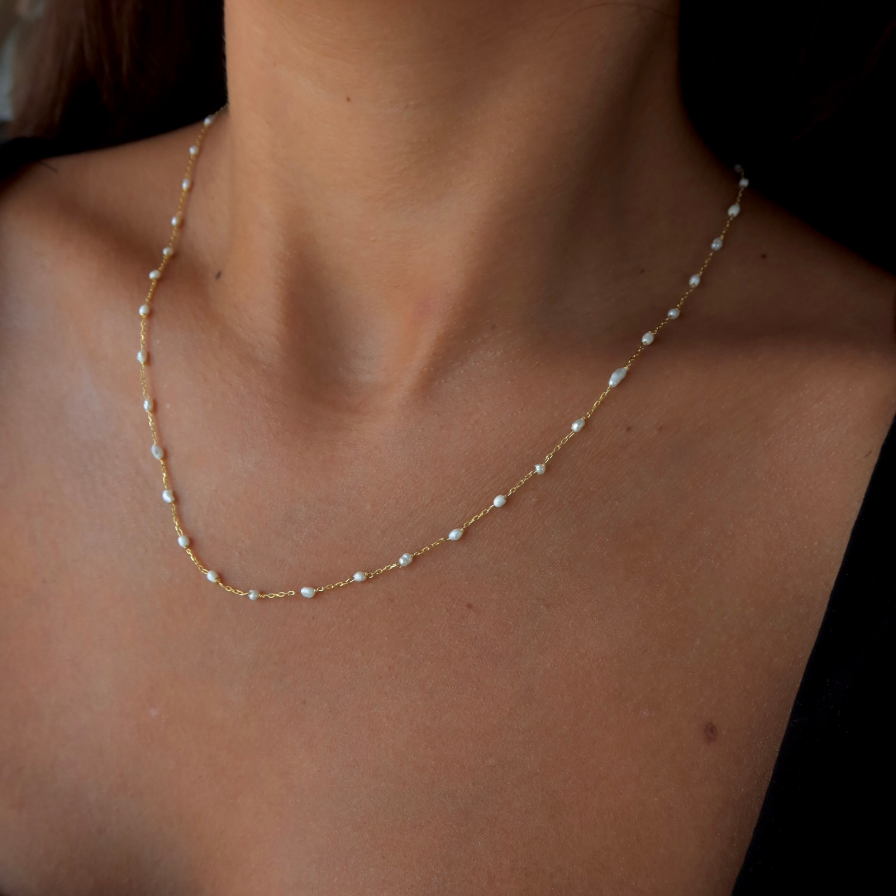 İncili İnce Kolye, 925 ayar gümüştür. Uzunluk 40 cm'dir +5 cm uzatma zinciri vardır.