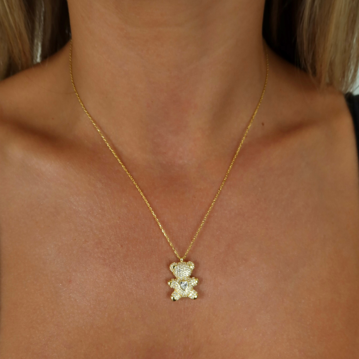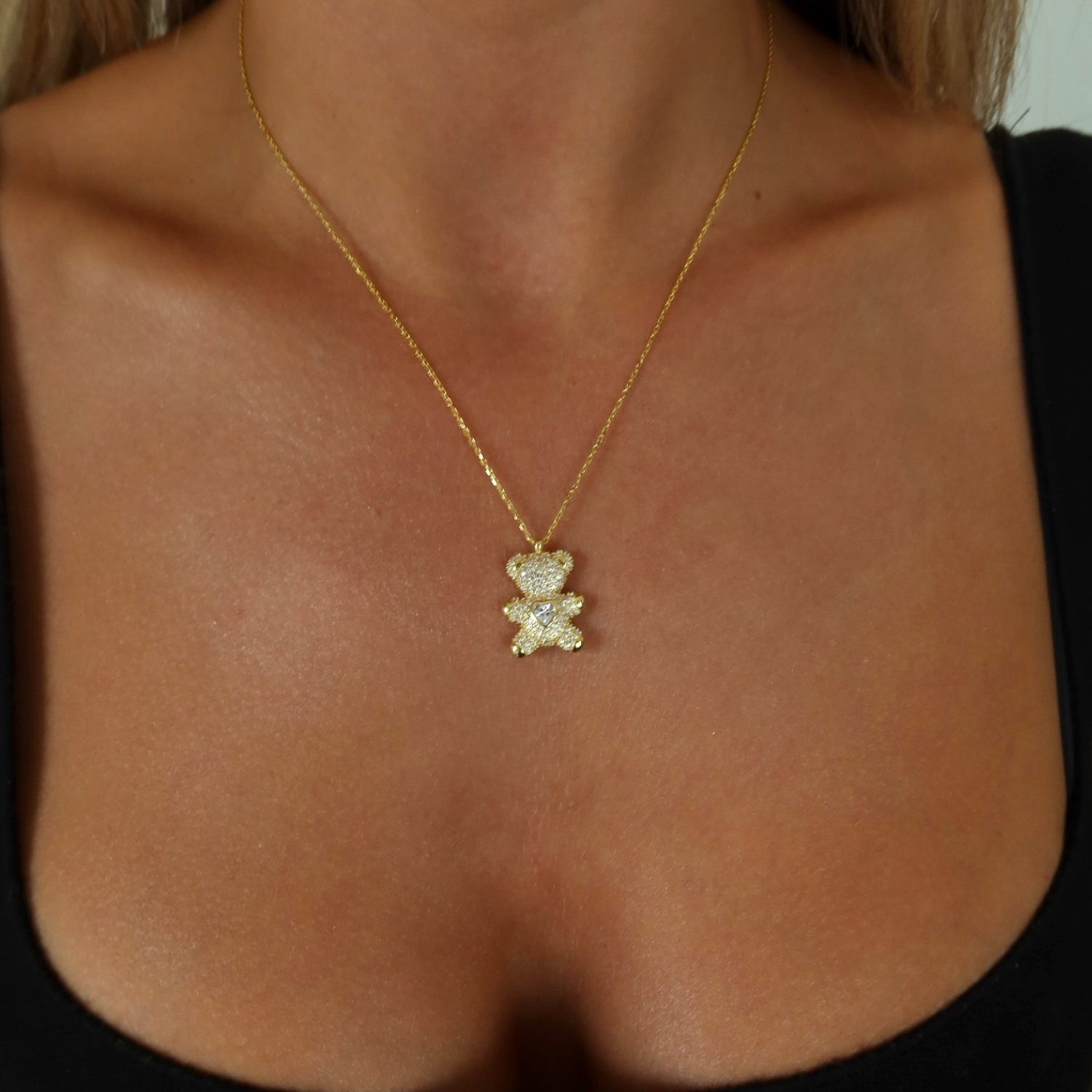 Taşlı Kalpli Ayıcık Kolye, 925 ayar gümüştür. Gold seçeneğinde altın kaplama yapılmaktadır. Zincir uzunluğu 40 cm + 5 cm uzatma zincirlidir.