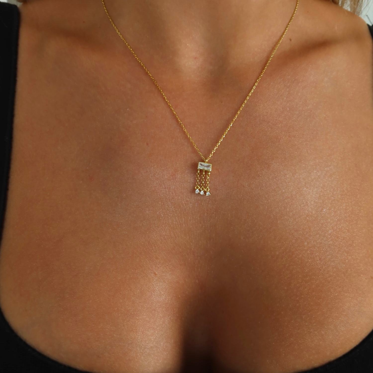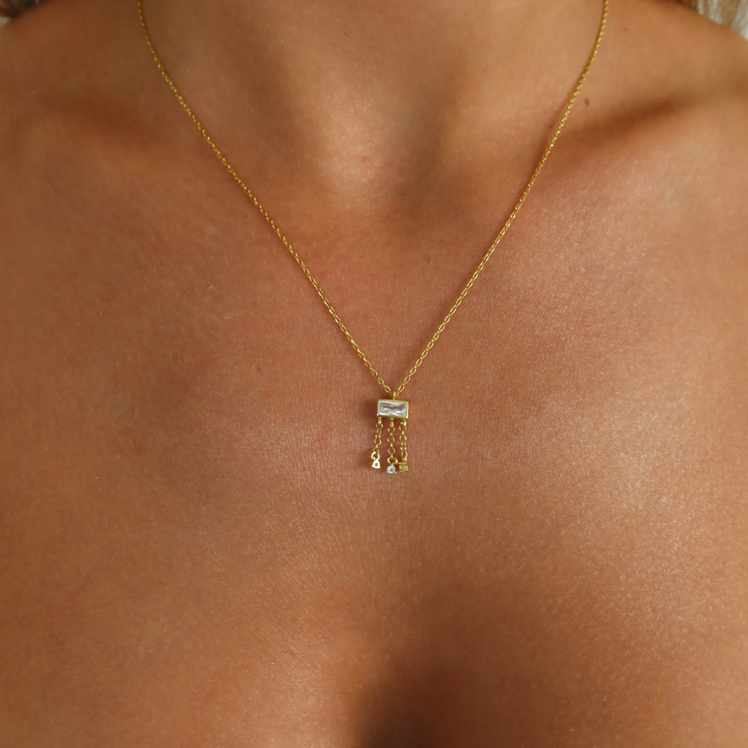 Üç Damla Işıltı Kolye, 925 ayar gümüştür. Gold seçeneğinde altın kaplama yapılmaktadır. Zincir uzunluğu 40 cm + 5 cm uzatma zincirlidir.