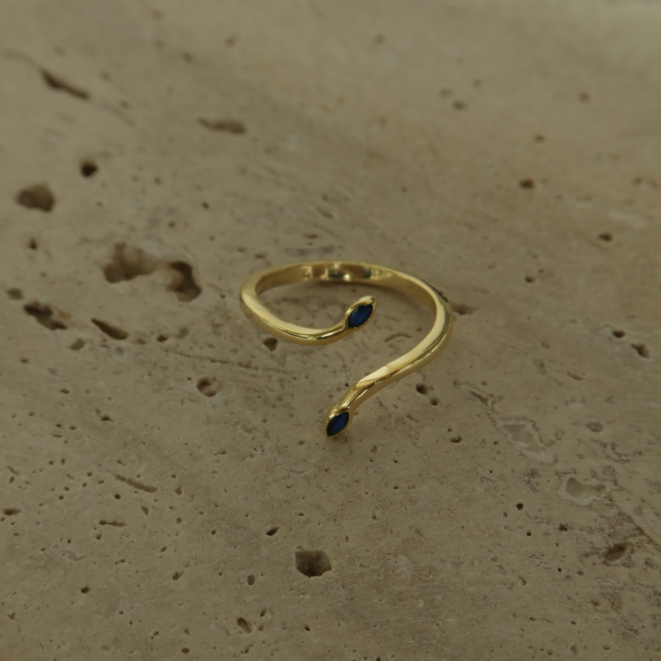 Serpina Yüzük, 925 ayar gümüştür. Gold seçeneğinde altın kaplama yapılmaktadır. Ayarlanabilir formu sayesinde farklı parmak ölçülerine kolayca uyum sağlar. Kapalıçarşı’daki atölyemizde ustalıkla üretilmektedir.