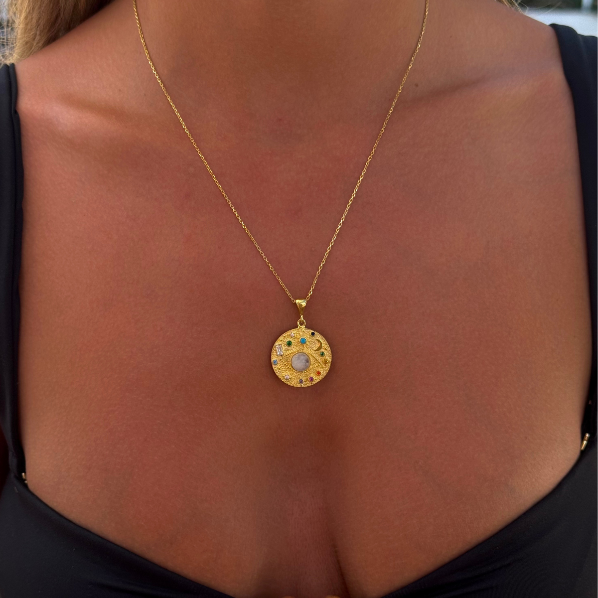 Ay Taşı Galaksi Kolye, 925 ayar gümüştür. Gold seçeneğinde altın kaplama yapılmaktadır. Zincir uzunluğu 40 cm + 5 cm uzatma zincirlidir.
