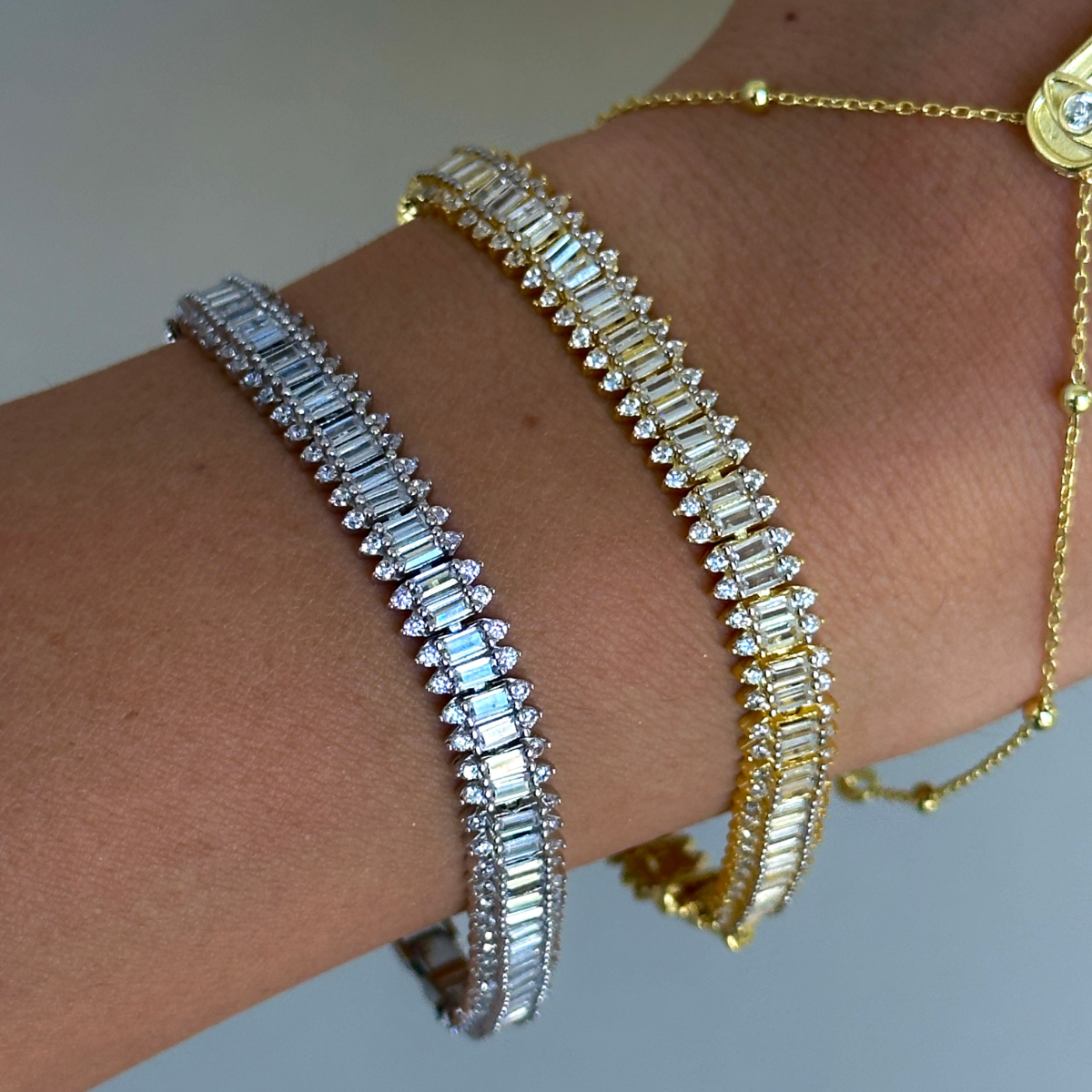 Baget Taşlı Işıltılı Bileklik, 925 ayar gümüştür. Gold seçeneğinde altın kaplama yapılmaktadır. Uzunluk 15 cm'dir +5 cm uzatma zinciri vardır. Kapalıçarşı’daki atölyemizde ustalıkla üretilmiştir.
