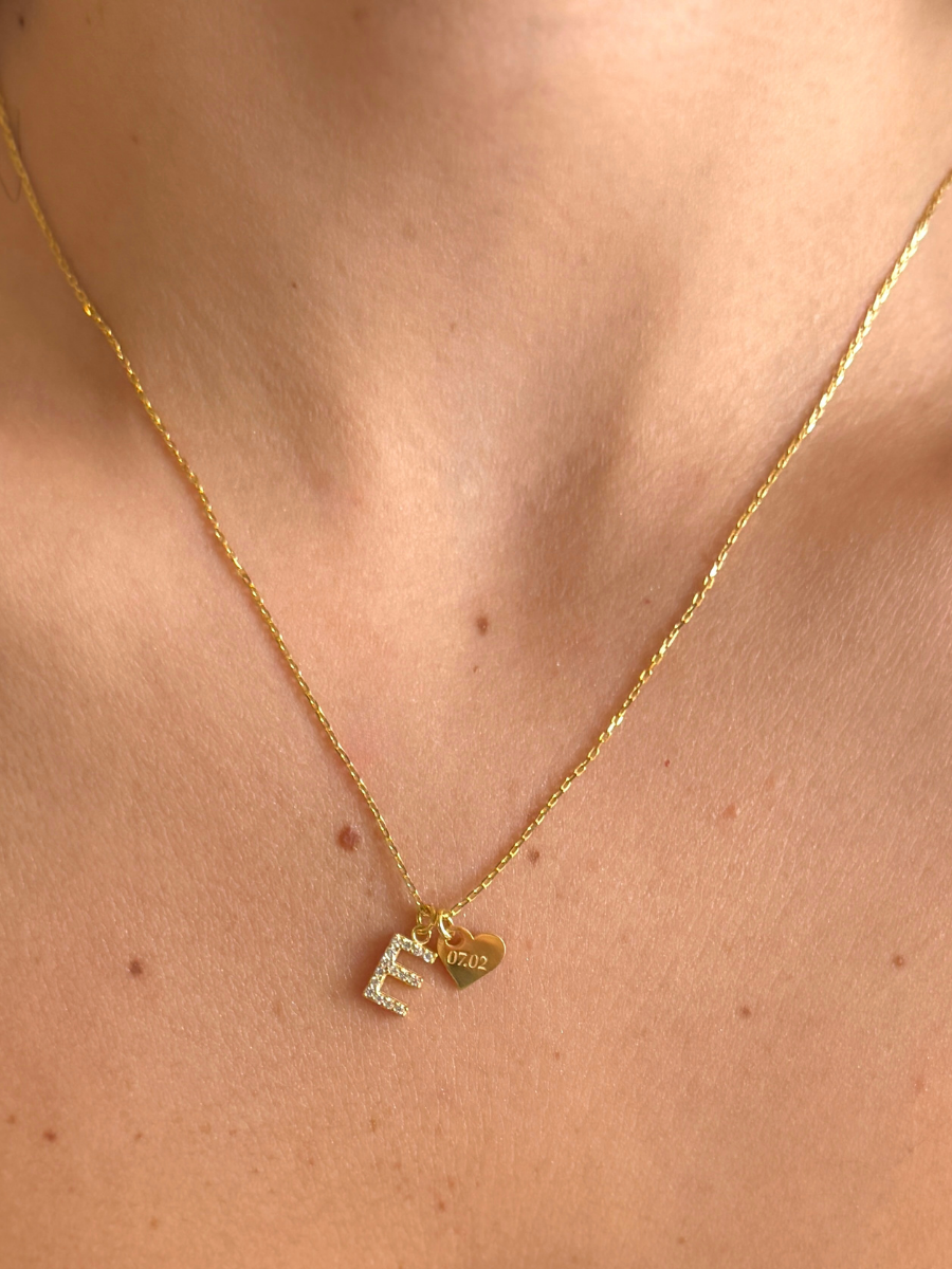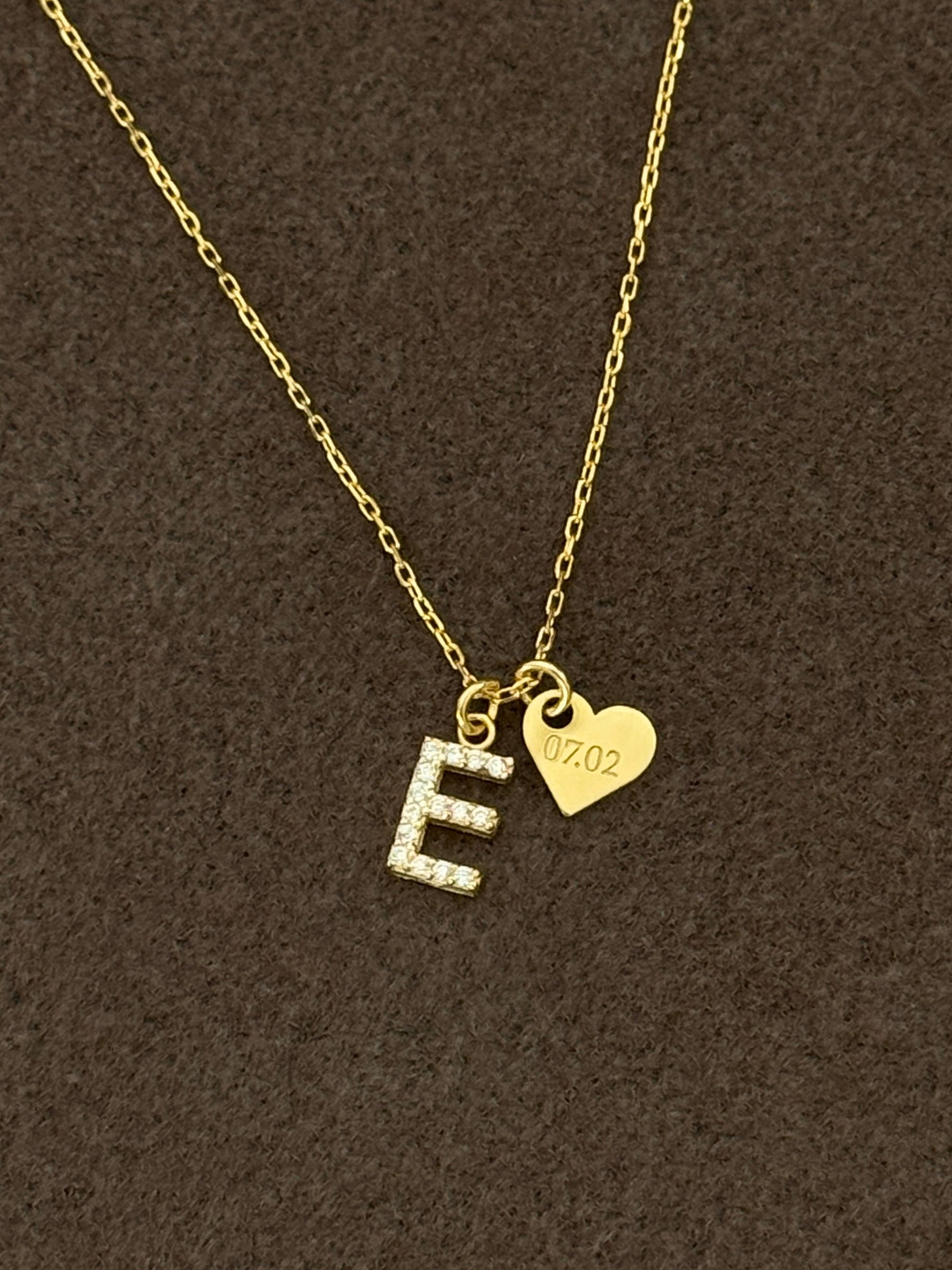 Harfli Kalp Plaka Kolye, 925 ayar gümüştür. Gold seçeneğinde altın kaplama yapılmaktadır. Zincir uzunluğu 40 cm + 5 cm uzatma zincirlidir.