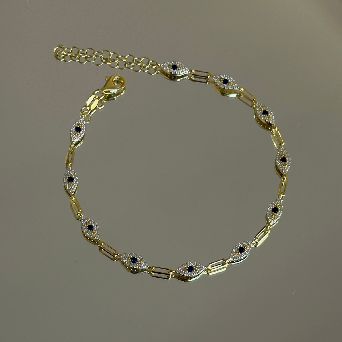 Taşlı Göz Figürlü Bileklik, 925 ayar gümüştür. Gold seçeneğinde altın kaplama yapılmaktadır. Uzunluk 15 cm'dir +5 cm uzatma zinciri vardır. Kapalıçarşı’daki atölyemizde ustalıkla üretilmiştir.