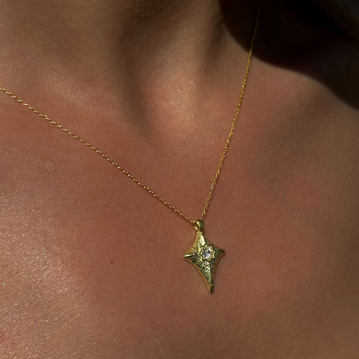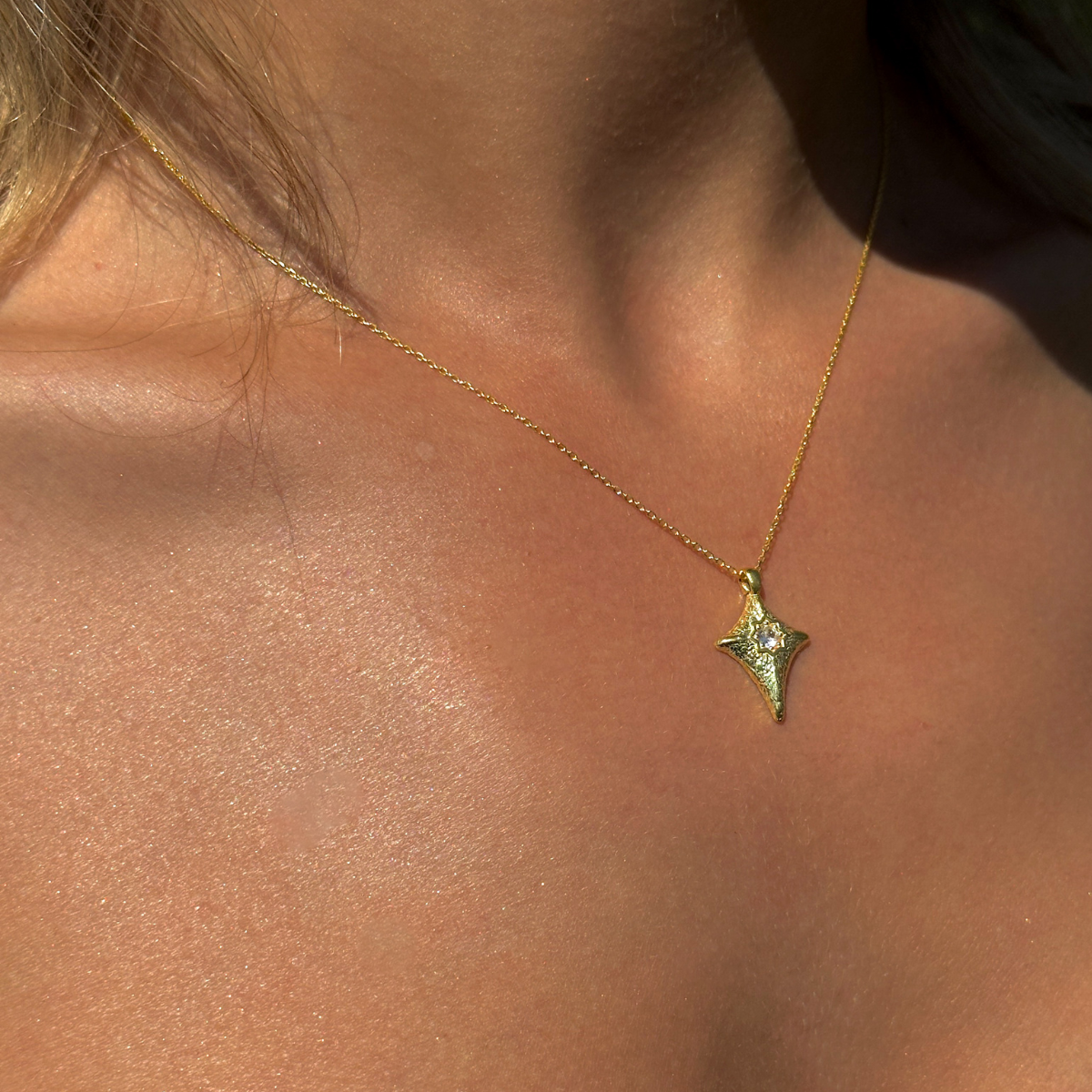 Taşlı Kuzey Yıldızı Kolye, 925 ayar gümüştür. Gold seçeneğinde altın kaplama yapılmaktadır. Zincir uzunluğu 40 cm + 5 cm uzatma zincirlidir.